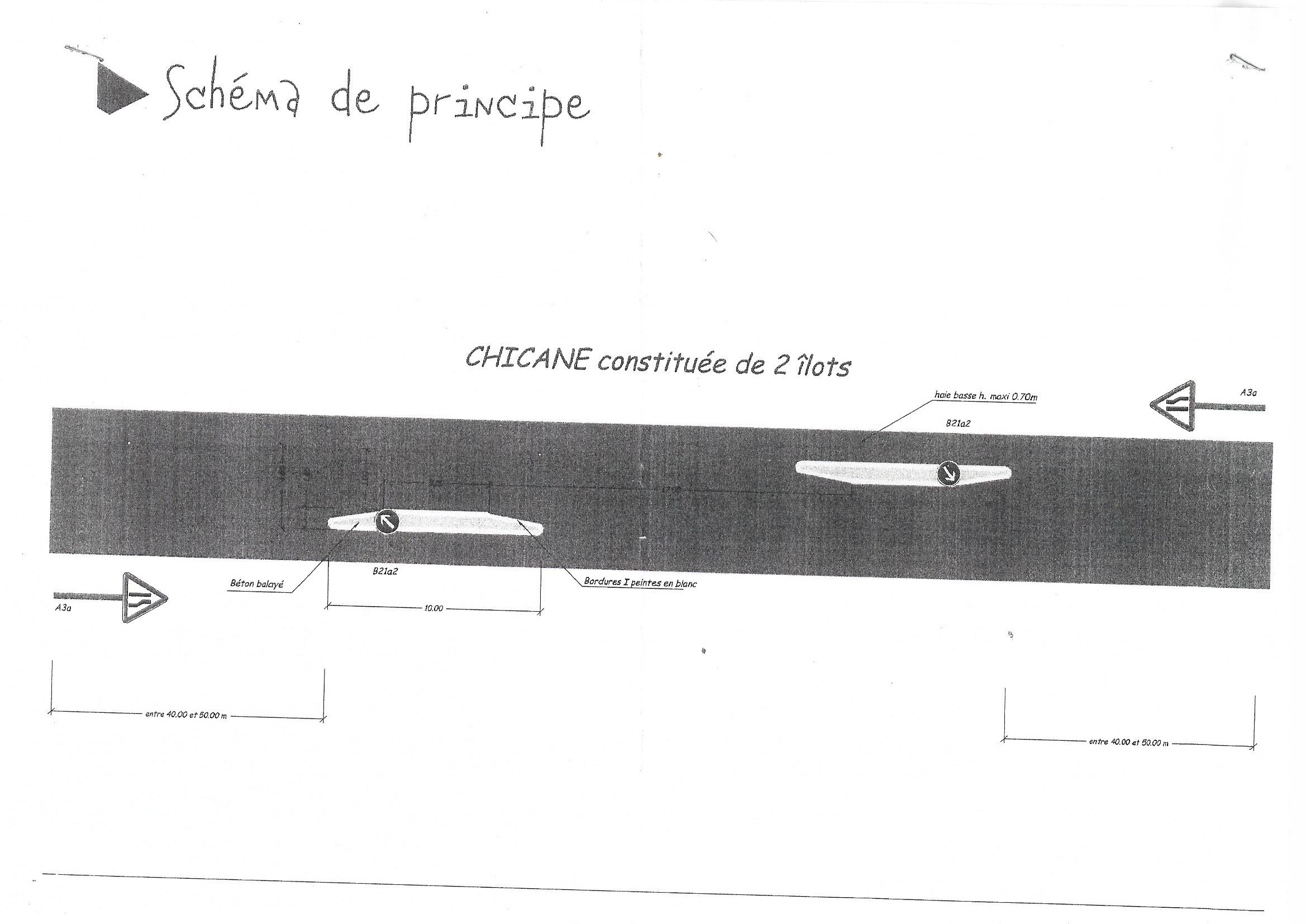 En rouge les quatre chicanes disposées en face deux par deuxAprès avoir étudié le schéma de principe d’une chicane. La largeur de la chaussée est comprise entre 4 m et 5, 40 m. Plus la chaussée est étroite, plus les accotements seront détériorés. Tout obstacle mis sur la chaussée entraînerait un aménagement des accotements. Certains ilots vont poser des problèmes à des riverains pour accéder à leur propriété (voir situation du Tauzin). Pourquoi ne pas mettre un ilot central en aménageant les accotements à la hauteur de la pièce de vigne et du futur lotissement de Saint Roch ?